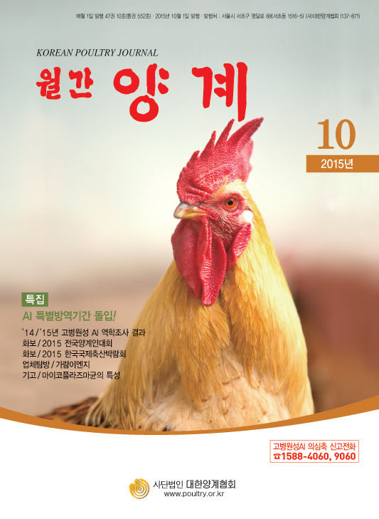 이달의 행사, 화보, 현장취재 108 People Inside / 이준형 사장(이삭농장) / 장성영 111 현장스케치 / 옥산휴게소(하행) / 최인환 112 화보 / 2015 전국양계인대회 / 최인환 118 화보 / 2015 한국국제축산박람회 / 최인환 124 업체탐방 / 가람이엔지 / 최인환 128 맛집탐방 / 열봉찜닭 / 장성영 특집 AI 특별방역기간 돌입! 132 14/15 고병원성 AI 역학조사 결과 / 홍보국 134 HPAI 예방을 위한 정부 정책 및 관리방안 / 김용상 138 AI 예찰업무의 중요성 및 예방대책 / 손한모 142 AI 차단을 위한 농가 대응방안 / 이홍재
